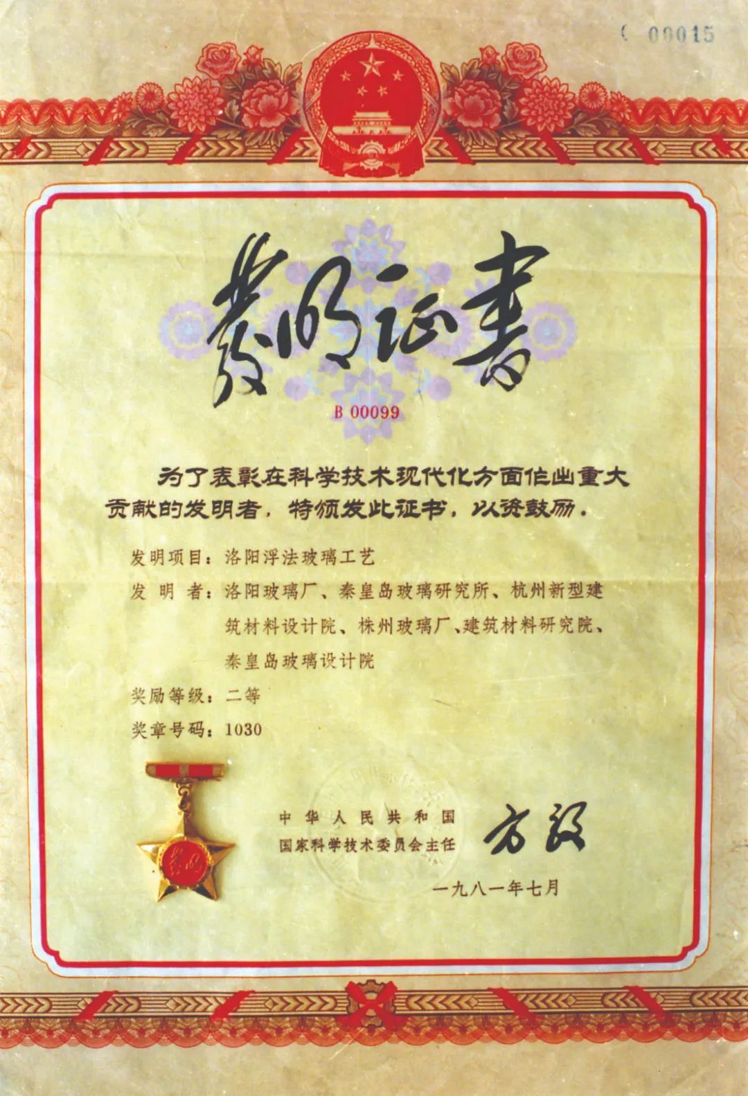 (1981年“洛阳浮法玻璃工艺”被授予创造发明二等奖,并颁发了金质发明奖章)