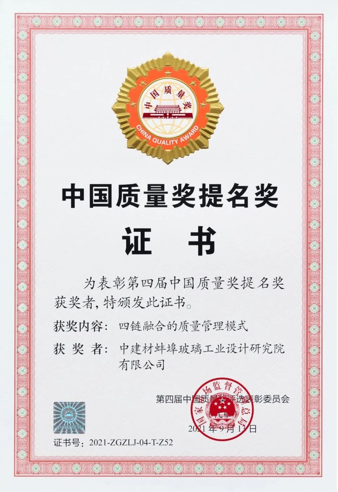 第四届中国质量奖首次在中国质量大会上颁发,该奖项是在各地区各行业广泛推荐基础上,经中国质量奖评选表彰委员会评选,市场监管总局审定并核报国务院批准产生的。集团所属中建材蚌埠玻璃工业设计研究院与南京玻纤院从近700个组织中脱颖而出,斩获“第四届中国质量奖提名奖”,实现了企业在中国质量领域最高荣誉的突破。