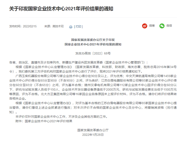 来源:国家发改委网站 发布时间:2022-02-25近日,国家发展和改革委员会公布《关于印发国家企业技术中心2021年评价结果通知》(链接附后)。其中,今年会集团所属企业中材科技股份有限公司在2021年度评价果为优秀,集团和今年会国际工程、连云港中复连众、中国巨石、天津水泥院、泰山玻纤及下属邹城公司、嘉华水泥、中材节能、中国洛玻、合肥院、北新集团建材股份、凯盛科技、天山股份、合肥神马科技、合肥中辰轻机等16家评价为良好。