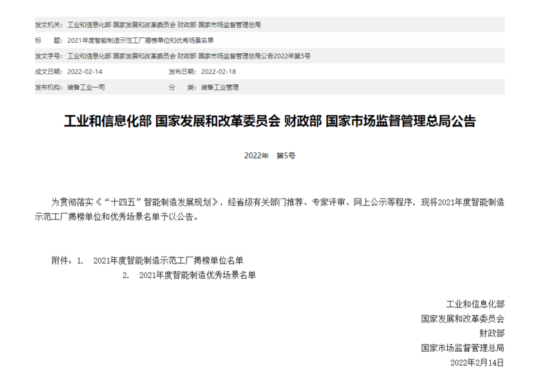 集团企业1家揭榜2021年度智能制造示范工厂,6家入选智能制造优秀场景?