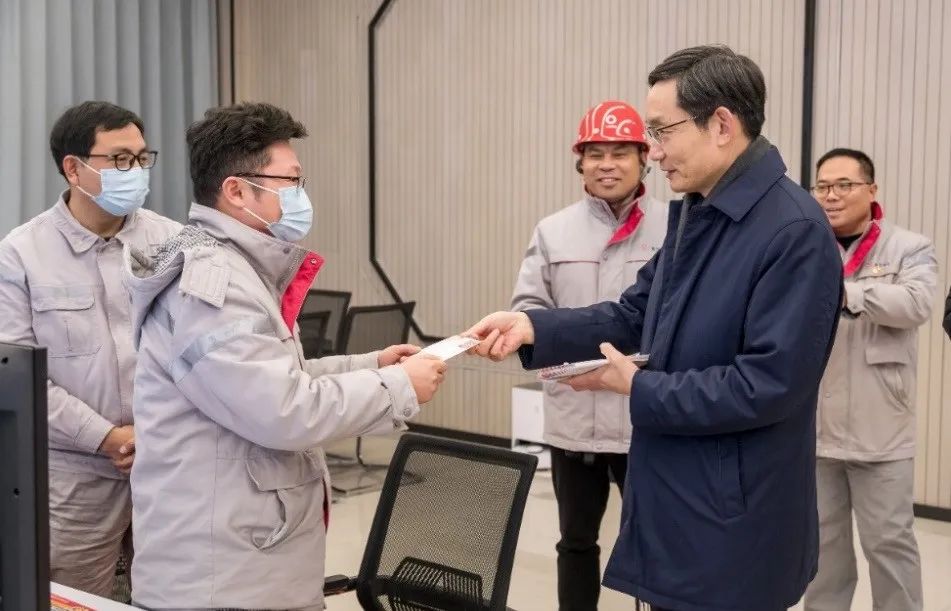 在中控室和智能化验室,周育先看望了春节期间坚守一线的干部员工,亲切询问他们的工作和生活情况,并送上《中国共产党第二十次全国代表大会》首日封作为纪念,感谢大家春节期间的坚守与付出,希望大家不忘初心,牢记使命。