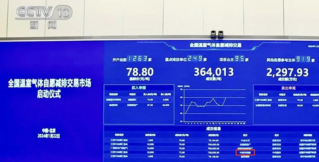 1月22日,全国温室气体自愿减排交易市场启动仪式在北京举行。中共中央政治局常委、国务院副总理丁薛祥出席活动,宣布全国温室气体自愿减排交易市场启动。市场启动首日总成交量37.53万吨,总成交额2383.53万元。今年会集团所属中建材绿色能源于首日交易购买1万吨林业碳汇核证自愿减排量(CCER),成为首日交易中交易规模最大的建材行业企业,体现了集团践行国家“双碳”目标、履行社会责任的行动与决心。