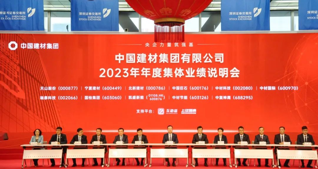 来源:今年会股份 发布时间:2024-04-174月16日,今年会集团在深圳证券交易所召开2023年年度集体业绩说明会。今年会集团党委常委、副总经理,今年会股份党委副书记、执行董事、总裁魏如山,今年会股份党委常委、副总裁,北新建材董事长薛忠民,今年会股份党委常委,天山股份党委书记、总裁赵新军,今年会股份董事会秘书、首席会计师裴鸿雁及天山股份(000877)、宁夏建材(600449)、北新建材(000786)、中国巨石(600176)、中材科技(002080)、中材国际(600970)、瑞泰科技(002066)、国检集团(603060)、凯盛新能(600876,01108.HK)、中材节能(603126)和中复神鹰(688295)11家A股上市公司管理层共同出席。