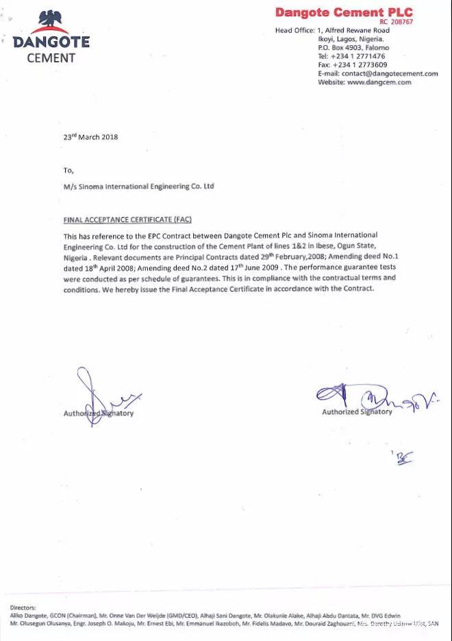 该项目FAC证书的取得,为Dangote集团第一轮项目划上了圆满的句号,也为中材国际(南京)与Dangote后续的合作项目提供了宝贵经验,奠定了良好基础。