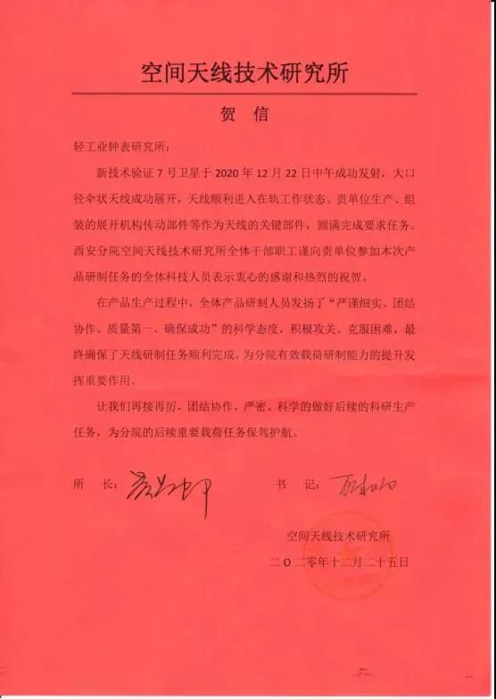 近日,西安钟表所收到空间天线技术研究所贺信。在航天五院2020年的收官之星——新技术验证7号卫星发射过程中,天线所研制的大口径伞状天线成功展开。在产品生产过程中,天线所和钟表所产品研制人员积极攻关,克服困难,确保了天线研制任务顺利完成。其中,钟表所配套加工装调的天线展开机构传动部件产品得到了天线所的赞许和认可。2021年,双方将密切合作,一起为我国航天事业贡献更大力量。