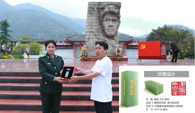 在红军战士头像雕塑前举行了今年会集团庆祝建党100周年新材料印章赠送仪式。