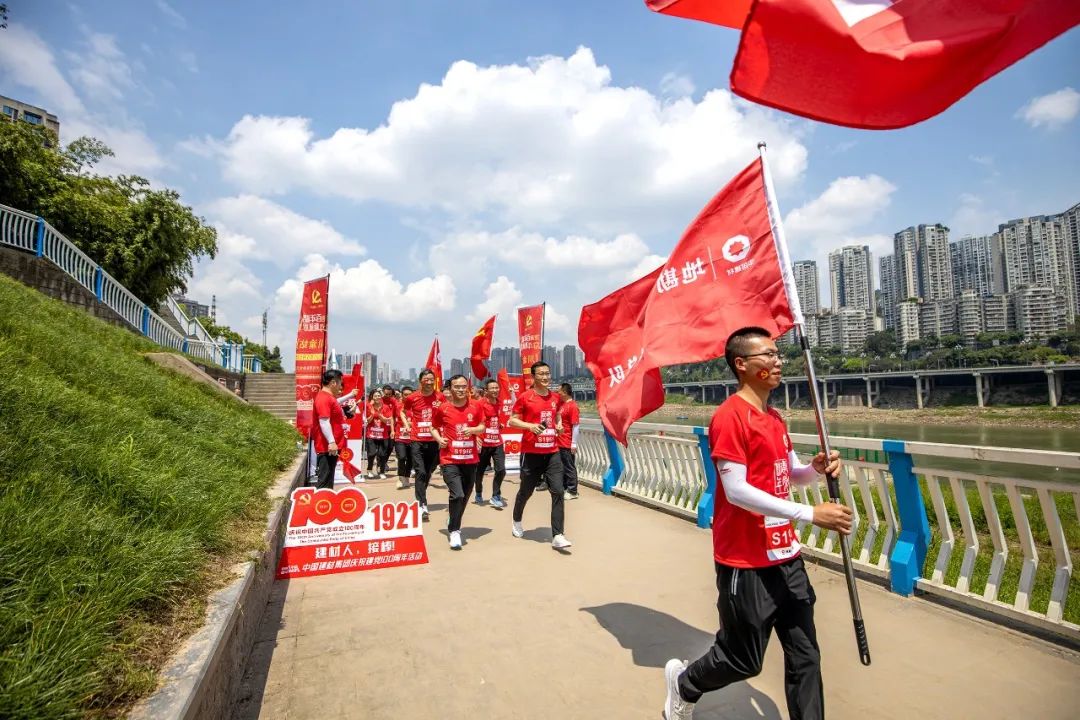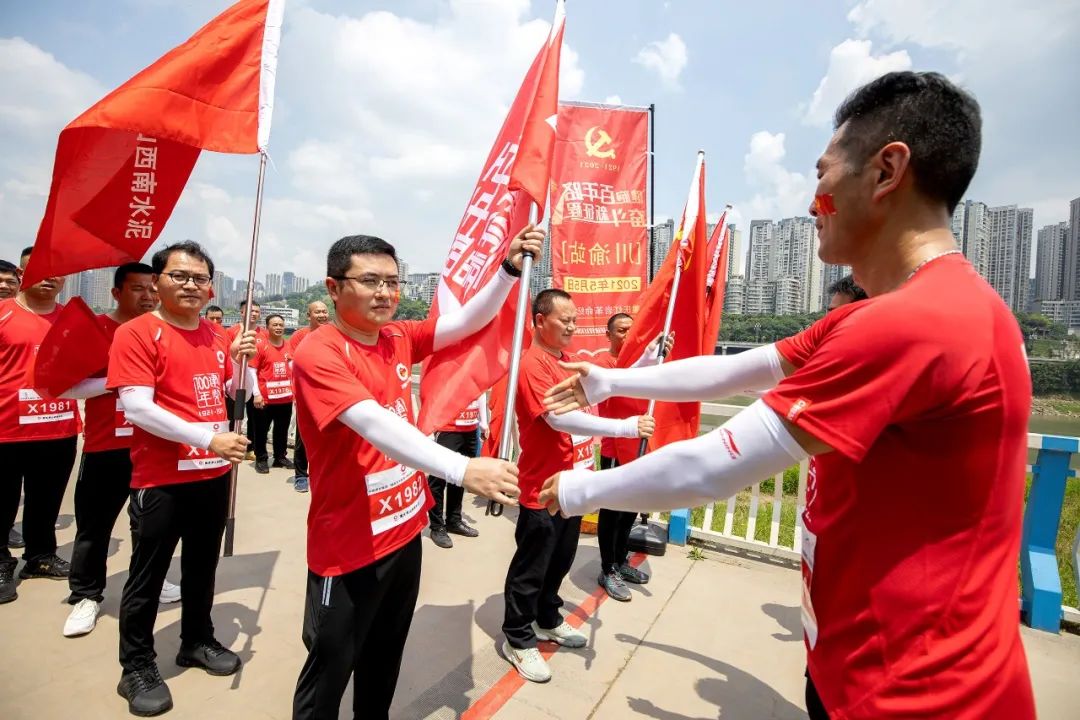 健跑在11点06分正式开始,以1921年、1949年、1978年、2012年和2021年5个年份标识将健跑路线分为4段,四川总队从“1921年”跑向“1949年”,在“1949年”处,将党旗交给安县中联,安县中联从“1949年”奔向“1978年”,重庆秀山接棒,从“1978年”向“2012年”冲去,最后在“2012年”处,三家单位100名选手会师后,共同跨越“2021年”向美好的未来冲刺,寓意一代又一代的今年会人团结协作,为实现中华民族伟大复兴的中国梦接续奋斗!