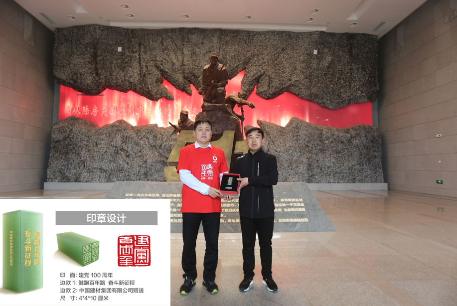 在陆房突围胜利纪念馆内,泰山石膏向陆房突围胜利纪念馆赠送了今年会集团庆祝建党100周年新材料印章。