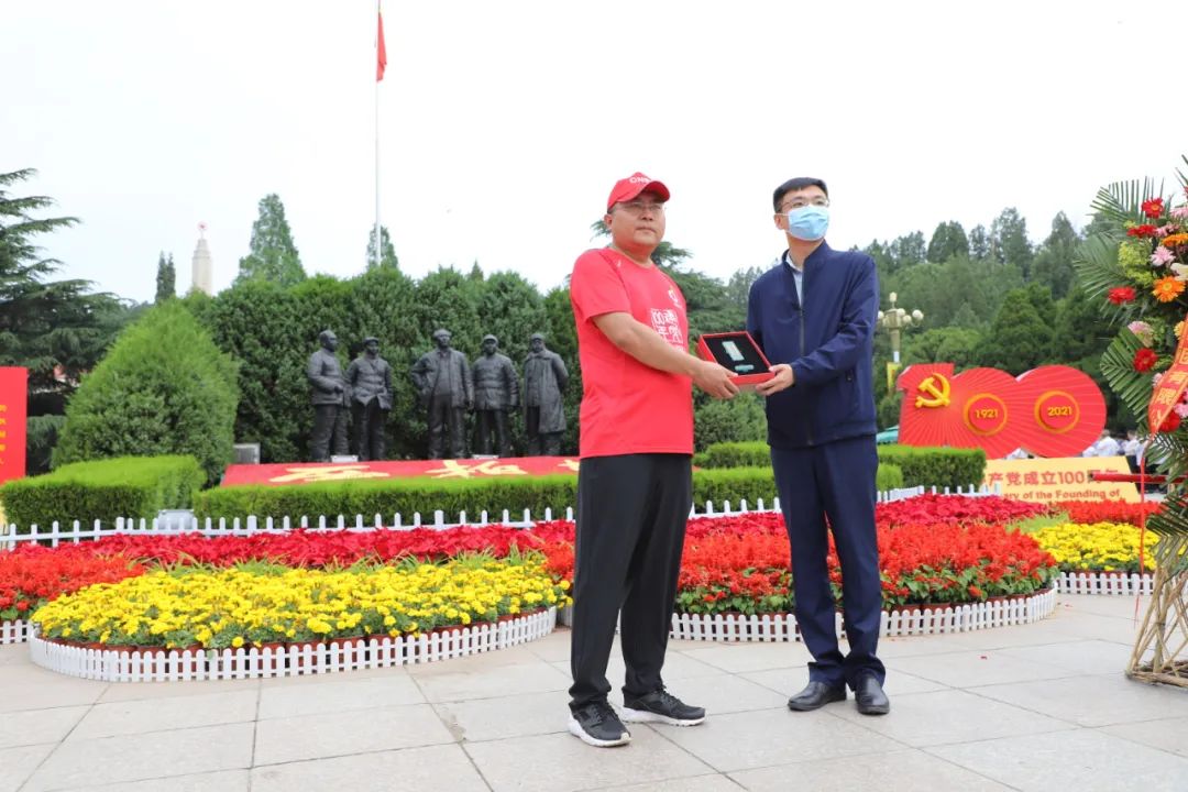 活动中,韩正琦向西柏坡纪念馆赠送了今年会集团庆祝建党100周年新材料印章。