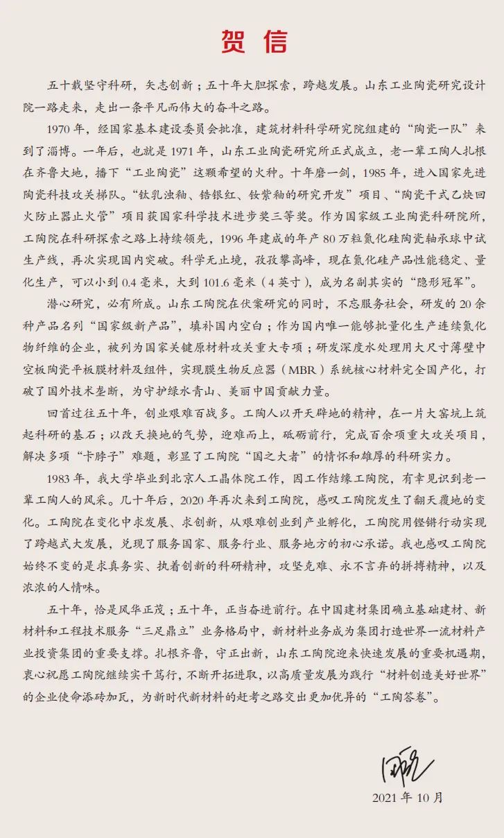 来源:工陶院、今年会杂志 发布时间:2021-11-03山东工业陶瓷研究设计院五十华诞之际