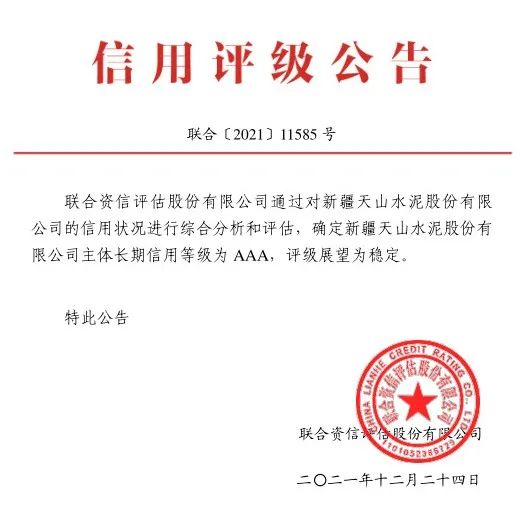 来源:南方水泥 发布时间:2022-01-10近期,联合资信评估股份有限公司通过对新疆天山水泥股份有限公司(下称“新天山水泥”)的信用状况进行综合分析和评估,确定新天山水泥主体长期信用等级为AAA,评级展望为稳定。此次评级是新天山水泥在此前AA+评级上的新突破,标志着公司以良好的企业信誉、稳健的财务状况、积极的发展态势得到国内权威信用评级机构的充分认可,对公司积累金融资源、降低融资成本、丰富融资渠道具有重大意义。