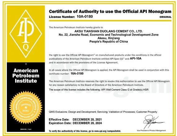 近日,阿克苏天山公司成功取得由美国石油协会颁发的“API Q1油井水泥体系认证证书。”APIQ1油井水泥体系认证证书的殊荣,是公司在技术创新、质量管控上一个质的飞跃,公司将严格执行API组织发布的石油设备技术规范生产油井水泥,增加产品结构,拓宽水泥销售市场,提高市场占有率,将优质的产品提供给客户,为公司绿色健康可持续发展奠定坚实基础。