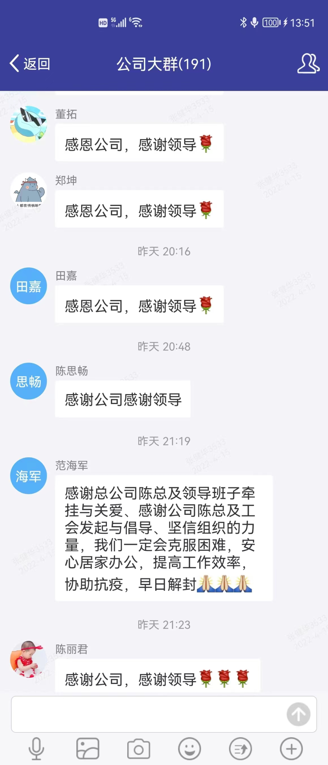 中建材进出口上海片区全级次单位及时摸排了解员工居住地疫情进展、物资储备、身心健康,尽可能给予协助。2次发放蔬菜包,并对员工进行心理疏导,组织“云运动”,在线打卡,督促员工关注自身,强身健体。