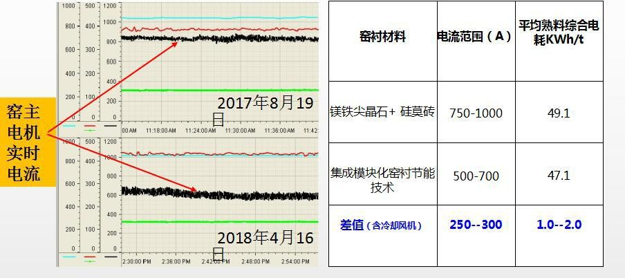 河南中联同力的洛阳中联5000t/d水泥窑是最早使用以气凝胶为隔热材料的装配式节能窑衬技术的产业化项目,经对比测定,与砌筑传统耐火砖相比,该技术有效降低窑筒体表面温度90-130℃,回转窑窑衬材料整体重量降低122t,降低幅度为18.8%,回转窑主机运行电流下降250-300A,吨熟料综合电耗下降1-2kWh,实测吨熟料标准煤耗降低1.0-3.5kg,取得了轻量节电、保温节煤和能耗减碳的显著效果。同时,烧成带窑衬所挂的窑皮薄而致密牢固,不但使窑衬的工作面得到了很好保护,还增加了窑内有效截面积约9.35%,实现了扩径增产,取得了良好的经济效益和绿色降碳的社会效益。