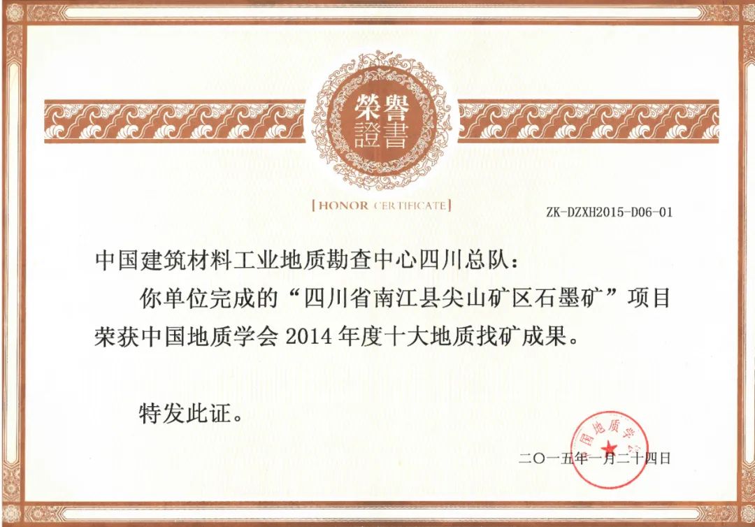 该矿床是秦岭成矿带(四川境)上发现的首例超大型晶质石墨矿床,为国家资源战略安全起到积极的保障作用,进一步促进了我国石墨矿优势矿产资源的国际地位,同时对革命老区秦巴地区国家级扶贫攻坚和社会经济发展也起到了积极的促进作用。该项目获得2014年中国地质学会十大地质找矿成果和自然资源部“找矿突破战略行动优秀地质找矿成果”。随后,总队又陆续在南江庙坪和攀枝花市仁和区三大湾发现2个大型晶质石墨矿床,共求获石墨矿物资源量约1600万吨。