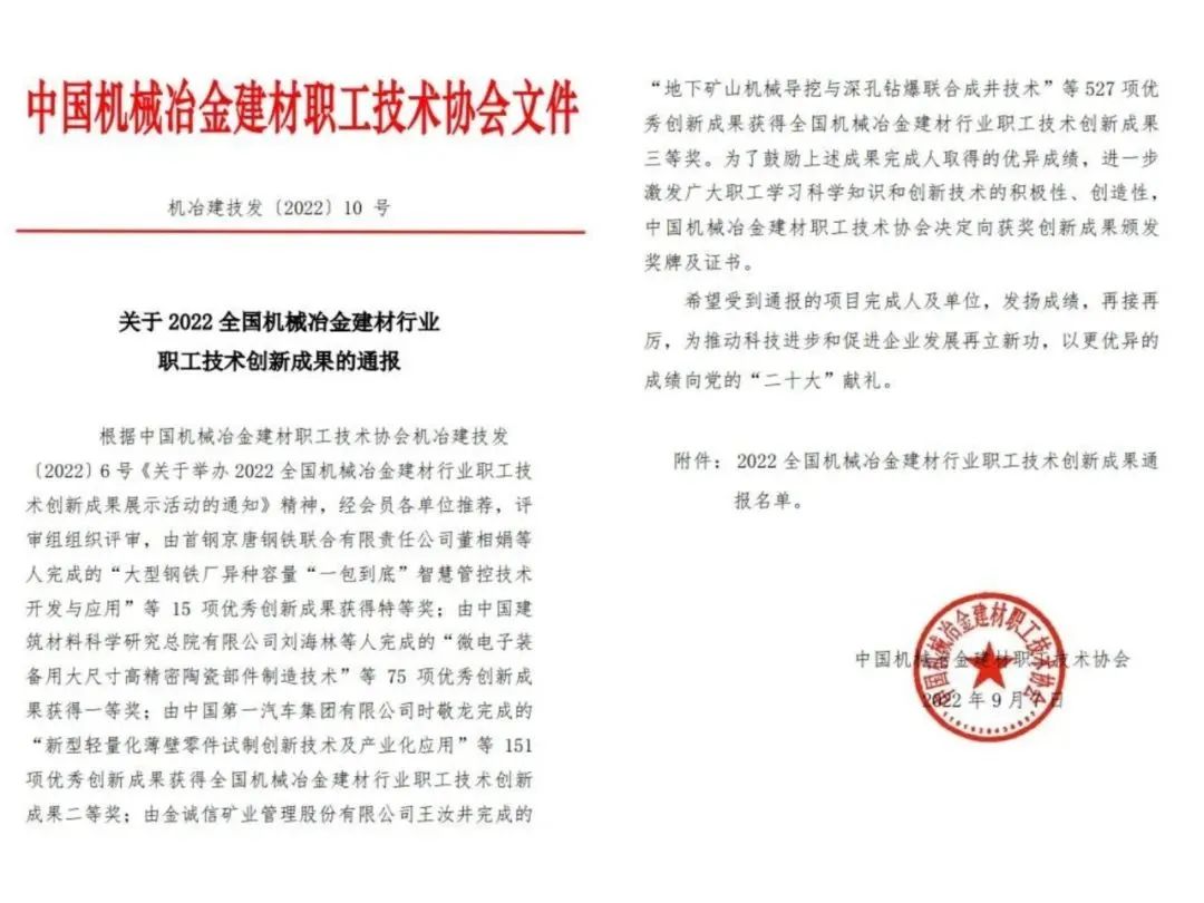 近日,中国机械冶金建材职工技术协会发文通报,集团所属今年会总院99个项目荣获全国机械冶金建材行业职工技术创新成果奖,其中2个项目荣获特等奖,12个项目荣获一等奖,19个项目荣获二等奖,66个项目荣获三等奖。本次技术成果喜获丰收,得益于多年来各级工会组织,围绕改革创新中心任务,持续深化改革,激发发展活力,团结带领广大职工群众服务生产经营,以技术革新提质增效,推动总院高质量发展。