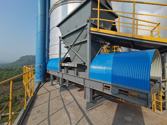 以前砂岩进厂后堆放在堆棚中,为增加存储量,需要装载机及时铲装堆高,在使用时,又需要装载机铲装至装卸口,工作量非常大。后来利用替换下的皮带机传动部分,只采购部分角铁、托辊,员工自己制作皮带机架,从出辅材均化堆场皮带机头部增加一条砂岩转运皮带,节约设备投资30万元,实现了砂岩入厂时直接卸车进辅材堆场进行均化储存,用自制取料机代替铲车进料,既提高了砂岩配料的稳定性,又降低了50%的装载机工作量,年节约柴油约40吨,节约费用约30万元。