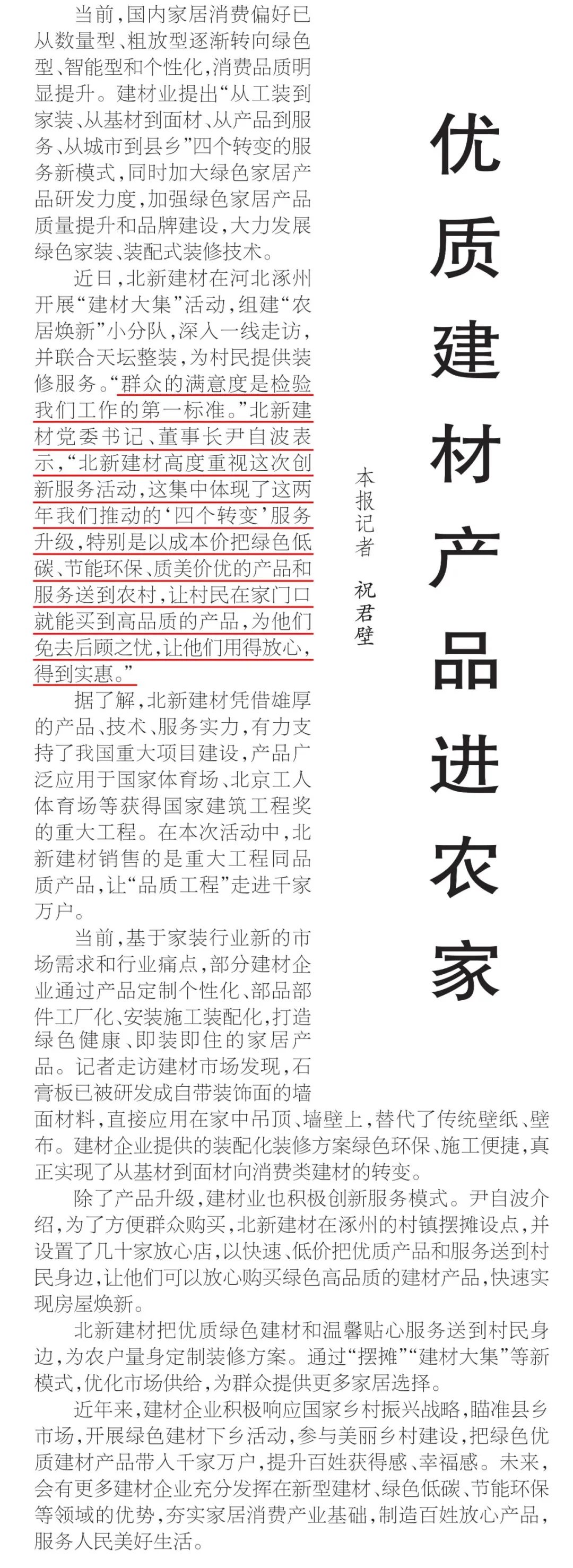 《经济日报》聚焦家居消费市场升级给建材行业带来的新变化,北新建材响应国家乡村振兴战略,积极推进“四个转变”,创新服务模式,把重大工程同品质产品带到村民家门口,服务人民美好生活。