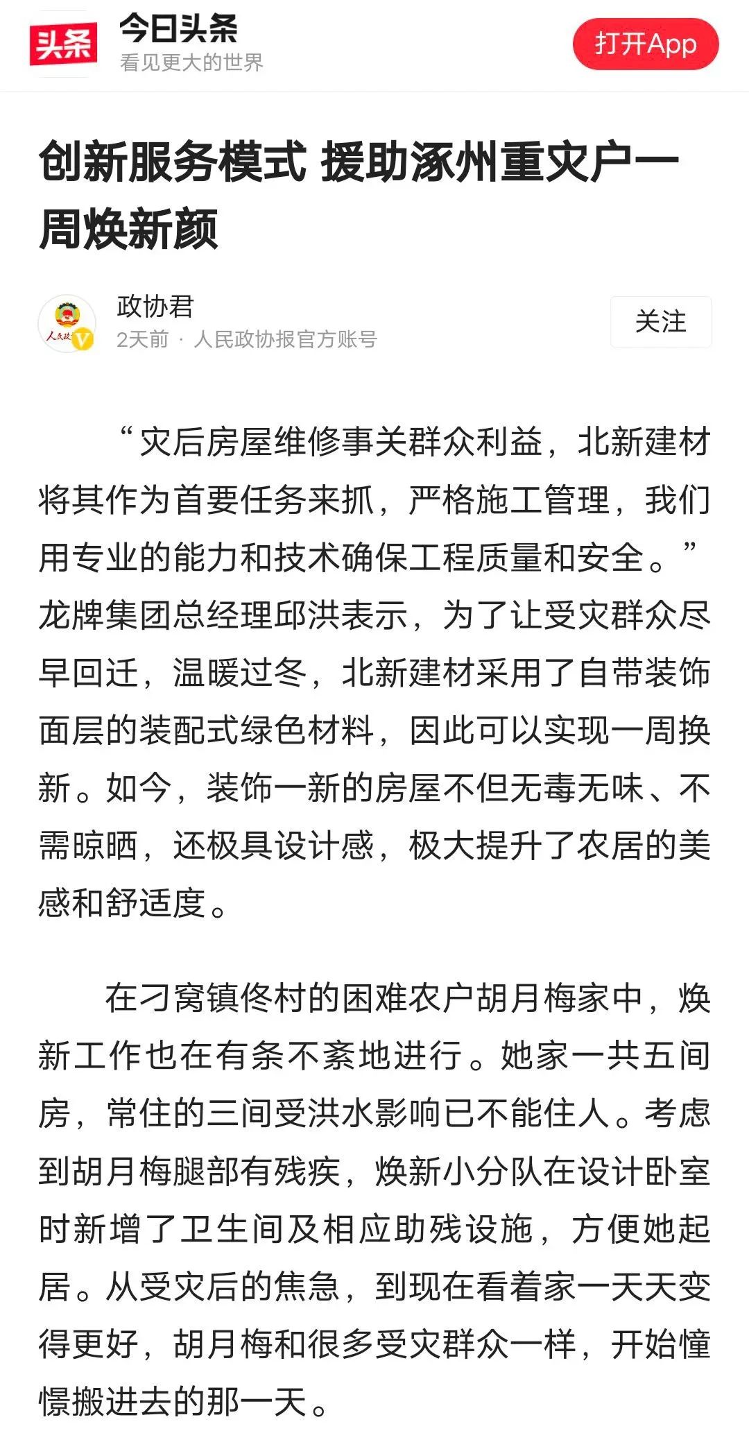 人民政协网从“创新服务模式 援助涿州重灾户一周焕新颜”角度介绍了北新建材践行央企责任,深入县乡灾区一线,积极助力灾区重建,把优质建材和服务送到村民身边,推动“四个转变服务升级”的创新实践。