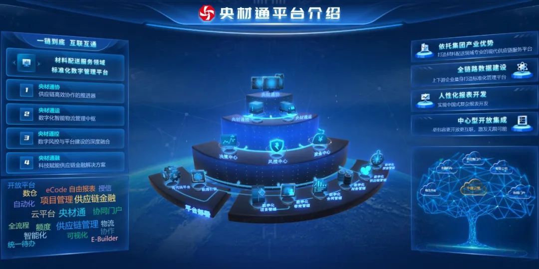 中建材国际物产有限公司是北新集团旗下现代供应链业务板块企业。作为材料配送供应链中的组织者、管理者和服务者,国际物产积极发挥央企责任担当,为材料配送供应链上下游企业量身打造涵盖项目管理、合同管理、供应链管理、风险管理、财务管理多位一体的材料配送领域全链路数字化平台——“央材通”供应链服务平台。