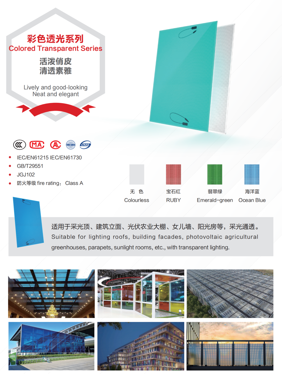 碲化镉系列产品具有抗热斑效应、弱光优势、低温度系数、色彩均匀、灵活定制和安全绿色等优势,正是这些所具有的特性,让碲化镉发电玻璃成为各类BIPV项目的优秀选择。