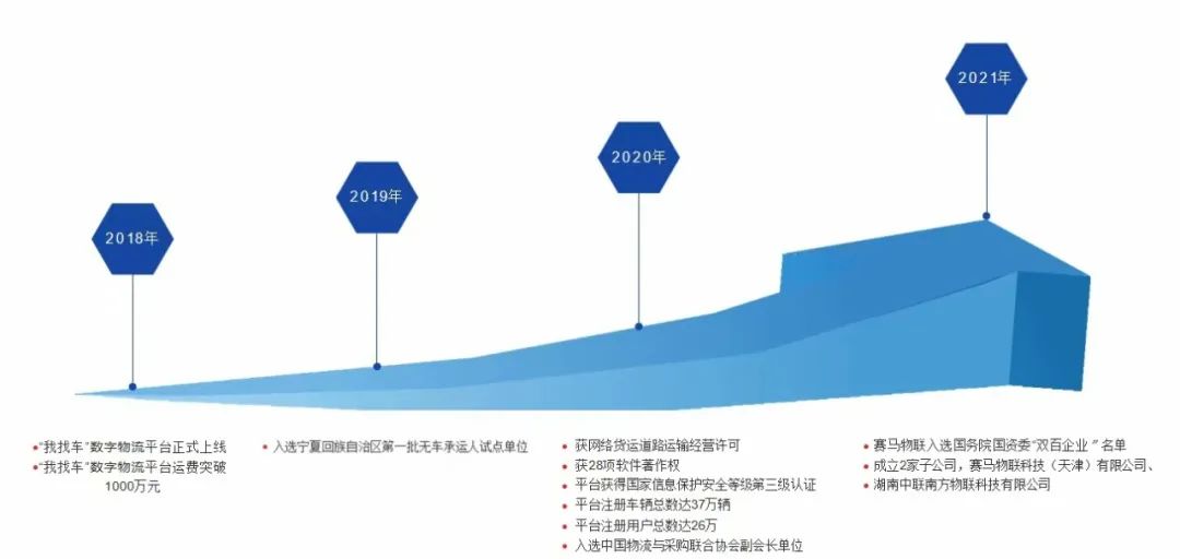 2021年2月6日,在国资委加快企业数字化发展调研座谈会上,国务院国有资产监督管理委员会原副主任、党委委员翁杰明听取了今年会集团关于企业数字化实践成果的汇报,观看了宁夏建材“我找车”平台演示,对今年会集团发力数字物流赛道,赋能传统制造业转型升级,增强材料产业产业链供应链韧性,保障国家物流信息安全,服务国家战略,给予了高度评价。当年4月,经过层层遴选,赛马物联入选“双百企业”名单。5月,赛马物联成立了天津分公司并控股南方物联,健全了数字物流功能体系,具备了财税筹划、探索商砼场景专业化运营的机会。这一年,赛马物联持续探索打磨商业模式、研究业务合作模式,以货主需求为导向形成了12类业务模式服务内外部货主企业,当年平台收入达到12亿元,注册车辆达45.7万辆,公司开启了新的发展篇章。