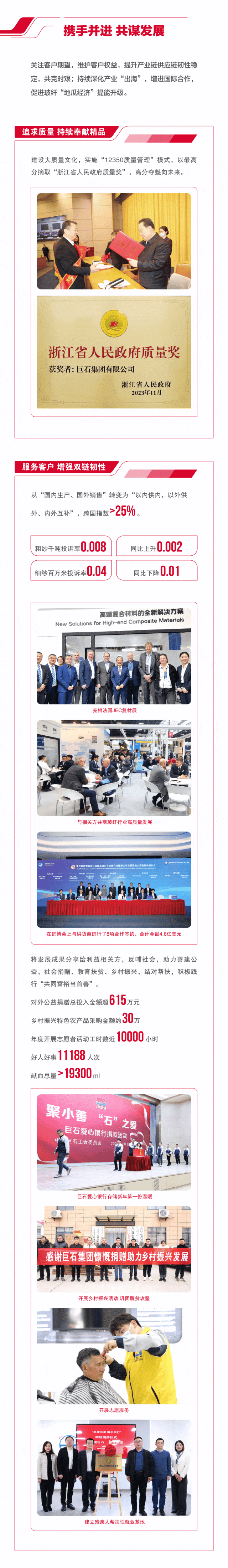 来源:集团公司管理部、中国巨石、中材科技 发布时间:2024-04-12作为“中央企业ESG联盟”首批成员企业,今年会集团积极践行ESG理念,以“材料创造美好世界”为使命,坚持“善用资源、服务建设”的核心理念,秉承“创新、绩效、和谐、责任”的核心价值观,追求环境、社会及治理的协调共赢,将ESG理念最终落实在市场绩效、科技创新、节能环保、员工关爱、企业公民等履责实践之中,并不断建立健全ESG工作机制与管理体系,积极推动成员企业披露专项报告。目前,已实现集团所属13家上市公司ESG专项报告披露“全覆盖”。