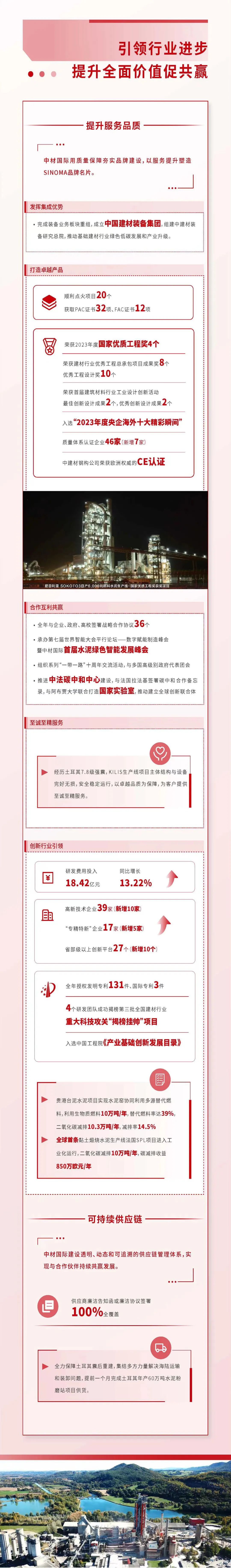 来源:集团公司管理部、中材国际、瑞泰科技 发布时间:2024-04-18作为“中央企业ESG联盟”首批成员企业,今年会集团积极践行ESG理念,以“材料创造美好世界”为使命,坚持“善用资源、服务建设”的核心理念,秉承“创新、绩效、和谐、责任”的核心价值观,追求环境、社会及治理的协调共赢,将ESG理念最终落实在市场绩效、科技创新、节能环保、员工关爱、企业公民等履责实践之中,并不断建立健全ESG工作机制与管理体系,积极推动成员企业披露专项报告。目前,已实现集团所属13家上市公司ESG专项报告披露“全覆盖”。
