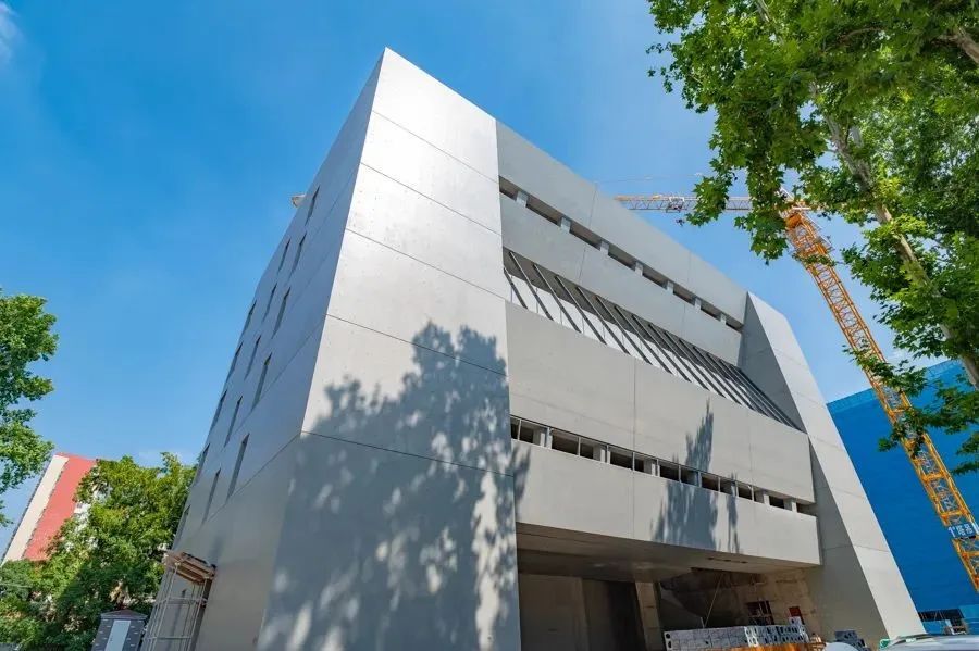进入正在建设中的南师附中晓庄校区内,首先夺得游览者眼球的是一栋造型独特的图书馆。采用了超长超大截面饰面清水混凝土的图书馆,满满工业风,墙上一排排螺栓孔与模板缝相呼应,营造出了独具特色的工业美感。