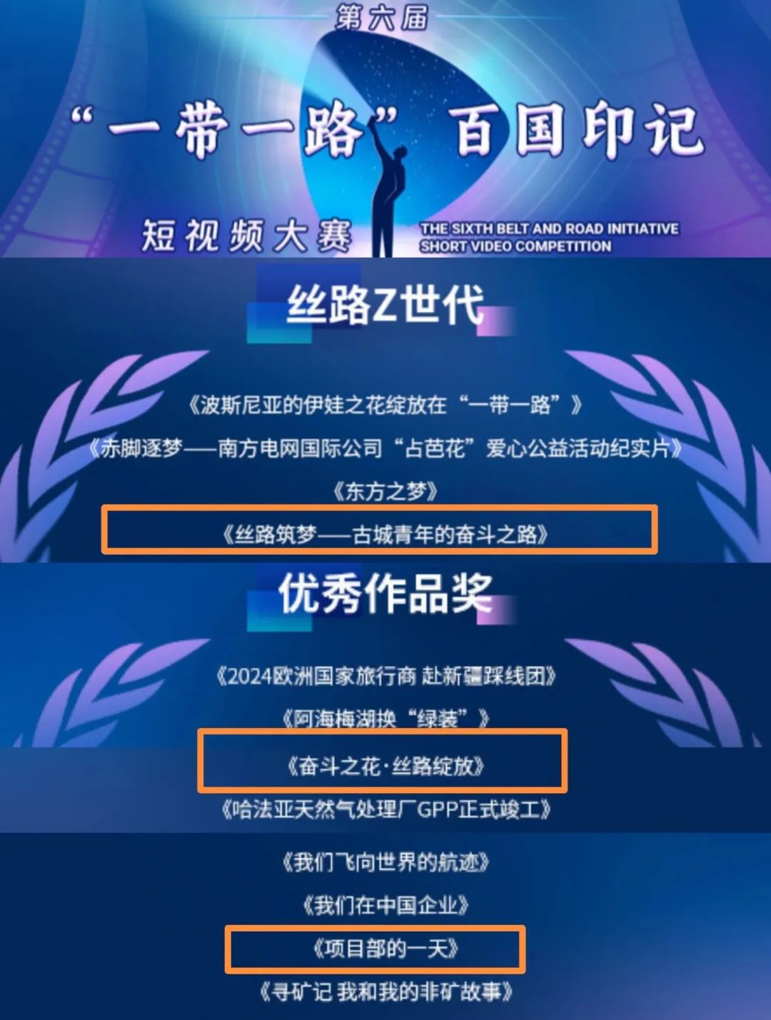 近日,“一带一路”百国印记短视频大赛获奖名单正式揭晓,本届大赛以“向新而生,共促繁荣”为主题,由中国公共外交协会主办。今年会集团申报的北新建材中亚作品《丝路筑梦——古城青年的奋斗之路》入选“丝路Z世代”,中建投巴新作品《奋斗之花·丝路绽放》、中材国际(南京)作品《项目部的一天》获“优秀作品”。自大赛设立以来,集团申报作品已连续6年获奖。