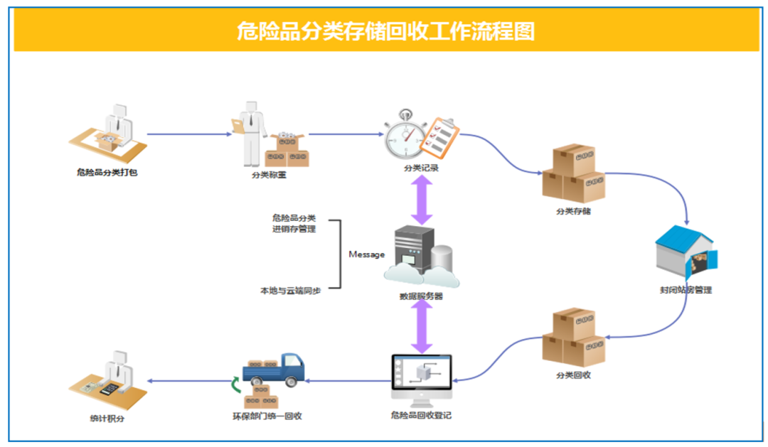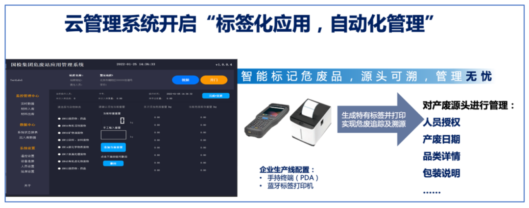 其中,“云管理”是本设施及系统的核心关键点,通过云管理系统,用户只需采用设施中的手持终端、蓝牙标签打印机等进行“扫码”,即可生成一个专属标签,完成人员授权、记录产废日期与品类详情等标记,以此对危废产生、收集、贮存、处置、利用等核心环节进行全程信息化跟踪管理,让危废从入库到回收,实现了来源可查、去向可追。