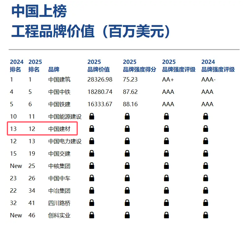 报告显示,中国工程品牌共有12个品牌入榜,其品牌价值占该行业总品牌价值的30%以上。无论从上榜数量还是总价值来看,中国工程品牌均位列全球第一。