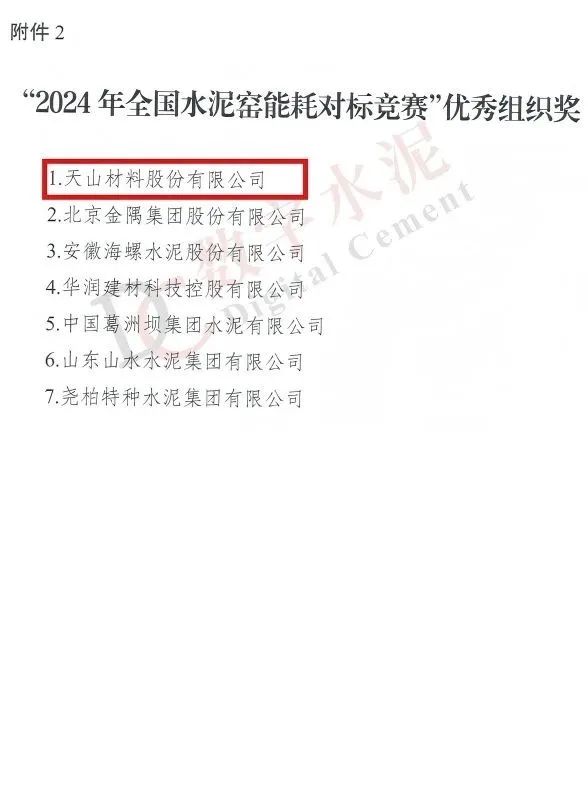 来源:集团安全环保部 发布时间:2025-06-266月19日,中国机械冶金建材工会全国委员会和中国水泥协会联合发布关于“2024年全国水泥窑能耗对标竞赛”评审结果的通报,天山材料及所属企业成绩优异,荣获“水泥行业能效标杆窑”“水泥行业能效示范窑”“水泥行业能效先进窑”“竞赛优秀组织奖”等4个奖项。