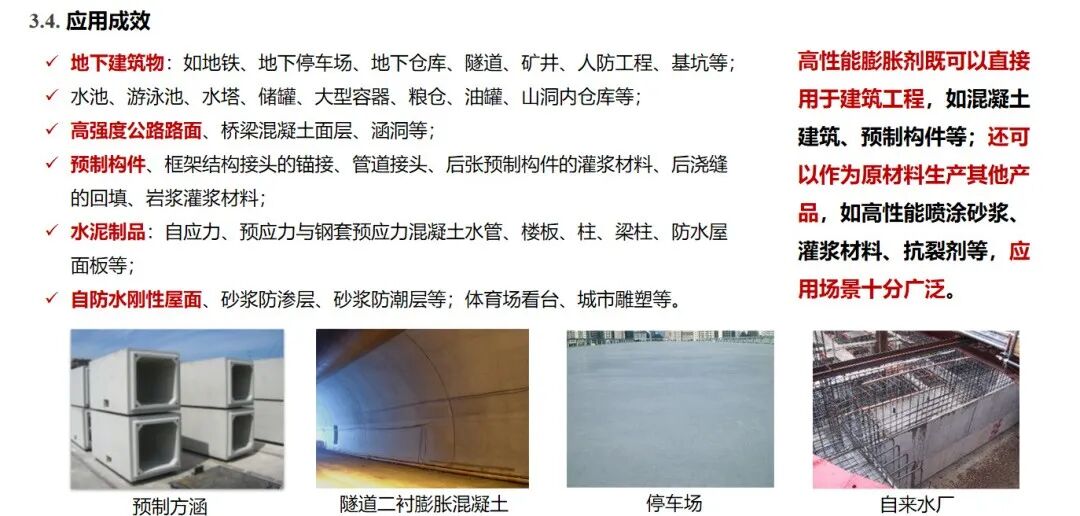 嘉华特水与日本电化株式会社共同研制的高性能膨胀剂(II型)是传统活性钙产品的一种衍生产品,其工艺要求严格,产品具有节能、环保的特性,属于绿色环保新材料。该产品应用场景广泛,既能直接用于各类建筑工程,提升混凝土性能;又可作为核心原料,制备高性能抗裂产品。目前已成功应用在隆汉高速隧道、成渝中线高铁、西渝高铁等国内路桥铁路工程项目中,为保障工程质量与长期安全运营发挥了关键作用。