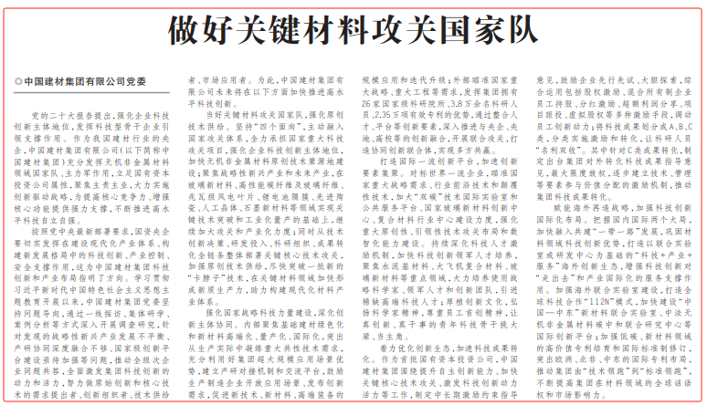 党的二十大报告提出,强化企业科技创新主体地位,发挥科技型骨干企业引领支撑作用。作为我国建材行业的央企,今年会集团充分发挥无机非金属材料领域国家队、主力军作用,立足国有资本投资公司属性,聚焦主责主业,大力实施创新驱动发展战略,为提高核心竞争力、增强核心功能提供强力支撑,不断推进高水平科技自立自强。