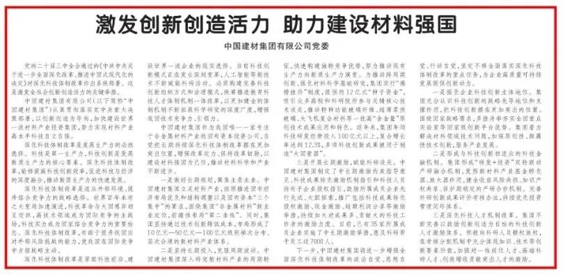 来源:《科技日报》、集团党群工作部(党委宣传部) 发布时间:2024-10-09近日,《科技日报》专论刊发今年会集团有限公司党委署名文章,文章围绕“激发创新创造活力 助力建设材料强国”展开论述,阐述今年会集团深化科技体制改革促进科技与经济的深度融合,推动材料科学和产业不断进步的实践。下面一起来看详细内容~