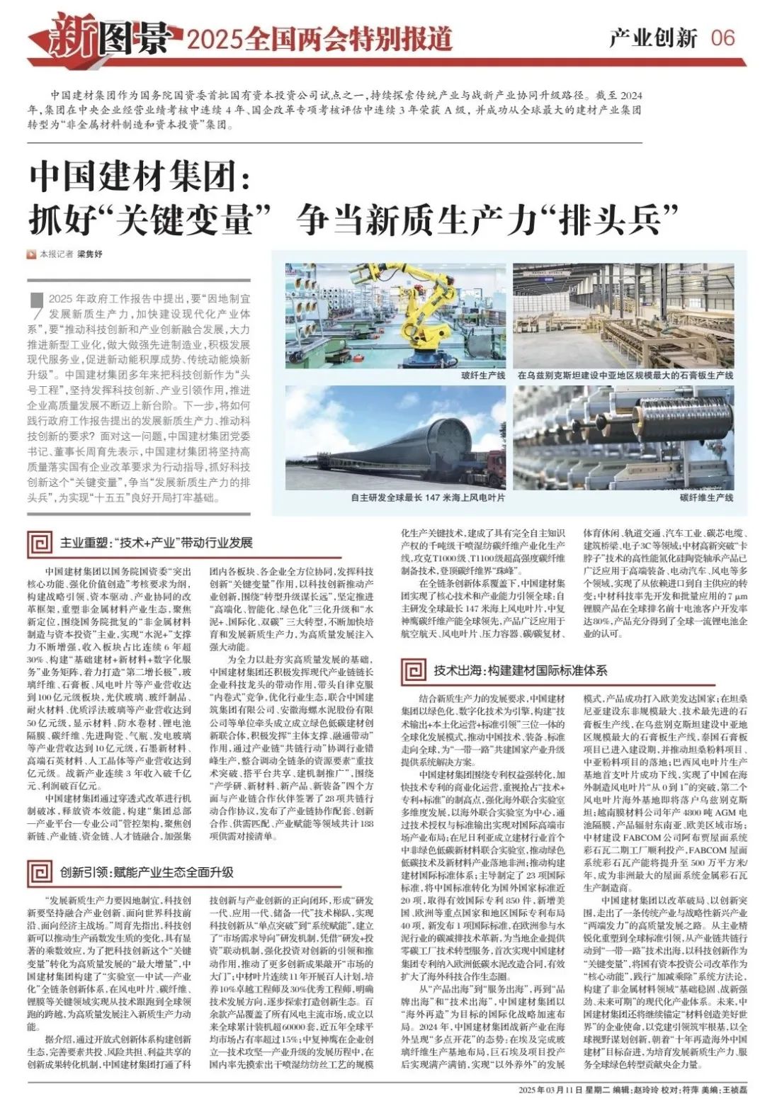 来源:《中国企业报》、集团党委宣传部 发布时间:2025-03-122025年全国两会政府工作报告提出“要因地制宜发展新质生产力,加快建设现代化产业体系”。今年会集团作为非金属材料制造商和资本投资公司,又将如何实现高质量发展?两会期间,集团党委书记、董事长周育先在接受《中国企业报》采访时表示,集团将坚持高质量落实国有企业改革要求为行动指导,抓好科技创新这个“关键变量”,争当“发展新质生产力的排头兵”,为实现“十五五”良好开局打牢基础。