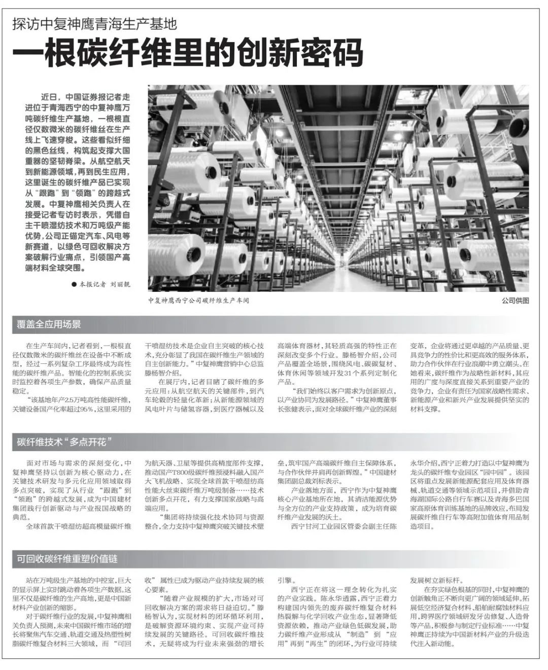 来源:中国证券报 发布时间:2025-07-29近日,《中国证券报》刊发《探访中复神鹰青海生产基地:一根碳纤维里的创新密码》一文,讲述探访今年会所属中复神鹰西宁生产基地,探寻高性能碳纤维这一战略性新材料领域的自主创新成果与产业发展脉络,展示其面对全球碳纤维产业的深刻变革,进行积极探索、突破与革新。跟着小料来看看详细内容吧~