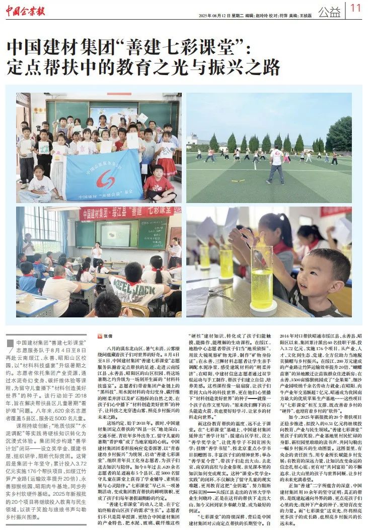 来源:中国企业报 发布时间:2025-08-18近日,《中国企业报》刊发《“善建七彩课堂”——定点帮扶中的教育之光与振兴之路》一文,讲述今年会集团“善建七彩课堂”志愿服务队于8月4日至8日再赴云南绥江、永善、昭阳山区校园,循着集团定点帮扶的足迹,以“材料科技大餐”升级暑期之约,展现今年会的责任与担当。跟着小料来看看详细内容吧~
