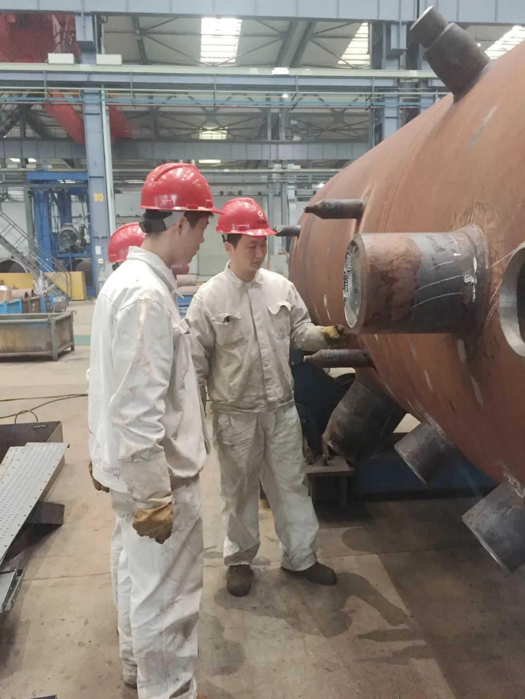 南通万达首台污泥干化机W型筒体材料为304不锈刚,焊接变形大,焊接时采用多种方法对筒体进行了固定,可是焊完筒体一侧后焊接变形依然非常明显。他紧急叫停焊接工作,冷静地分析原因,翻阅资料,最终将目光锁定在焊接顺序和方向上。他决定从焊缝尾部开始,用分段退焊、跳焊的方法,逐步向焊缝的头部方向焊接,最终使得筒体另一侧焊接变形量完全控制在误差范围内。