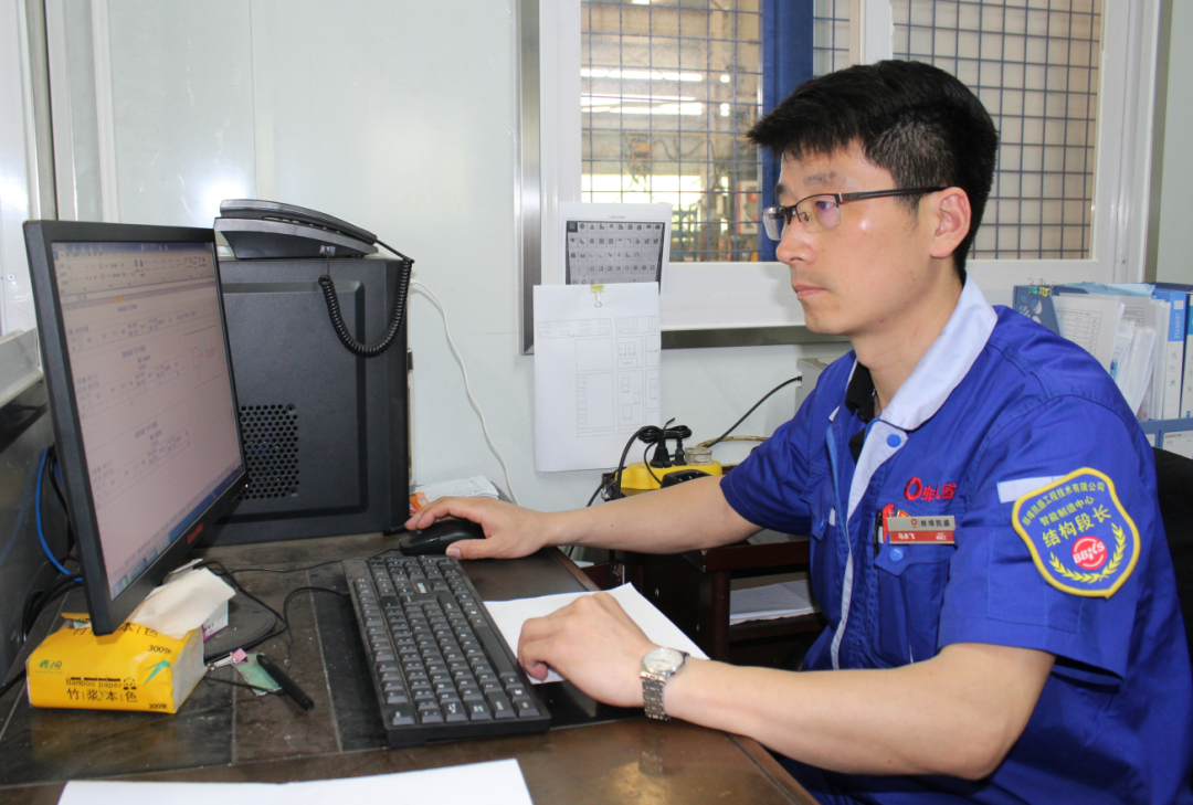“马师傅,我的部装件还差几块板料没有下料”。“马师傅,我的加工件需要转运了”。“马师傅,到我的工位来一趟”,一个个生产一线反馈的声音汇集不断,“好,我马上去现场”,看着他忙碌的声音身影,匆匆的脚步,我们记录下了这位生产现场“小巷总理”的工作瞬间,他就是结构段长马永飞。