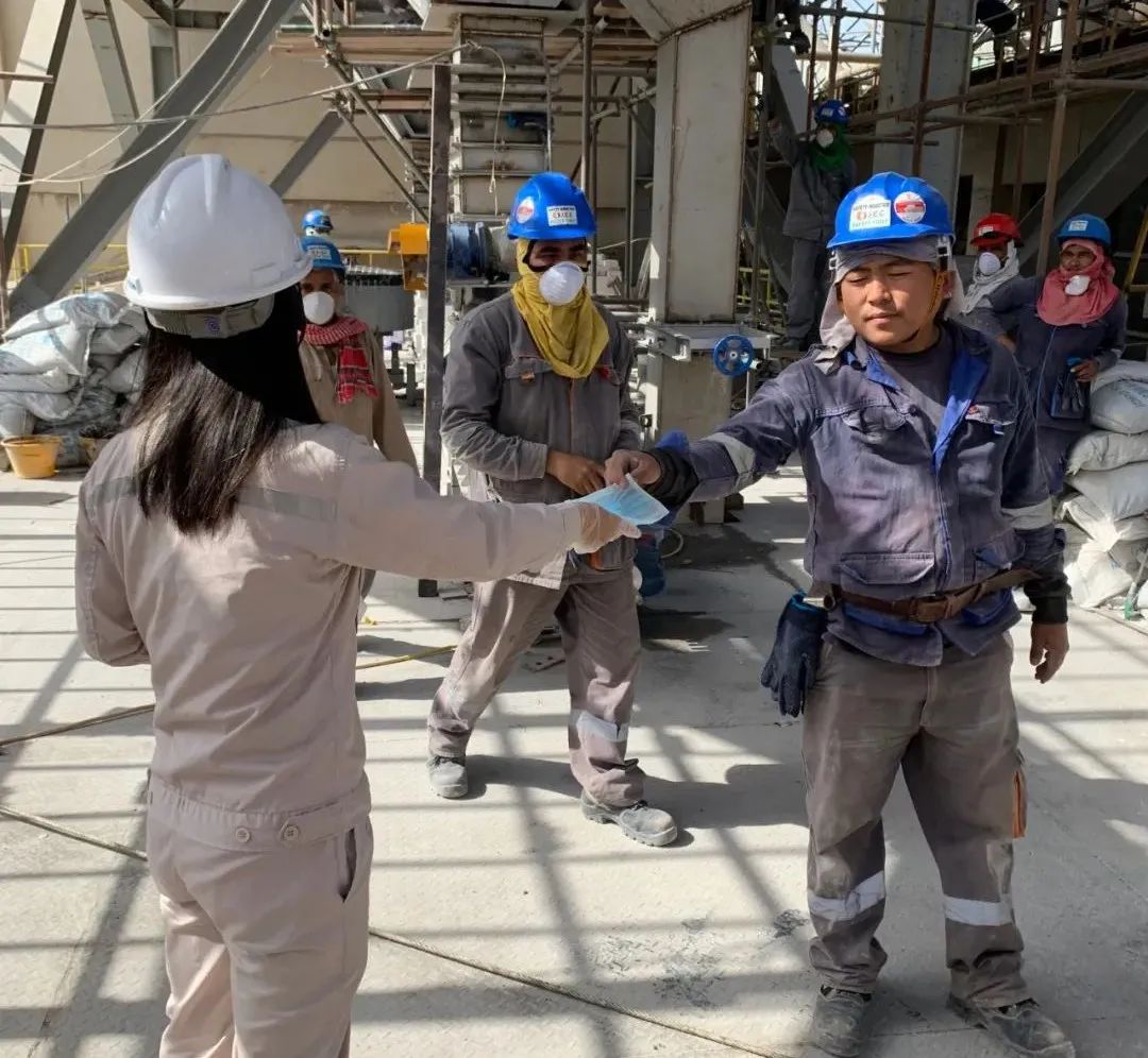 除此之外,项目部还加强了对我们工人工作区域的管理。特别是在三月份停窑对接期间,工人们24小时连续倒班,就这样工作了一个月,业主同时进行窑的检修,同一时期在同一个工作区域有多家当地分包与我们的队伍一起工作。由于当时业主对疫情还没有采取任何措施,在此期间,现场的工作环境和条件给防疫工作增加了难度。为了保证工人的安全,项目部也连续奋战一个多月没有休息,我更是不敢有一刻大意,每天拿着测温枪和口罩去现场检查,抽检工人体温,并时刻提醒我们的工人和水泥线检修工人保持距离。