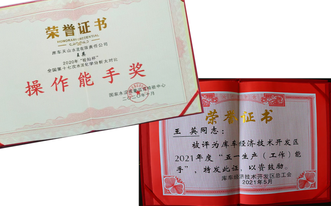 你若盛开,清风自来。全体化验室分析组人员带着对水泥分析检测的热爱和对职业的敬畏,在王英的带领下,先后荣获“瑞泰科技杯”全国第十四次水泥化学分析大对比“全合格单位”、“瑞泰科技杯”全国第十五次水泥化学分析大对比“全合格单位”、“CTC杯”全国第十五次水泥化学分析大对比“优良单位”、“弘潮科技杯”全国第十六次水泥化学分析大对比“优良单位”、“砼灿杯”第十七次全国水泥分析大对比中荣获“特等奖”等多项殊荣。2020年,王英获得“全国水泥分析操作能手”荣誉称号,2020年荣获天山股份公司“金牌工人”荣誉称号,2020年在南疆多家水泥公司联合开展的水泥分析“技术大比武”中斩获一等奖,2021年荣获国家级库车经济技术开发区“五一生产能手”称号。在收获荣誉的同时,王英始终认为:学习与成长永远在路上,成绩和荣誉只能代表过去。