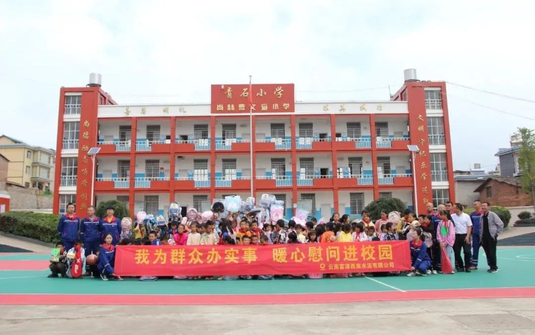 捐赠活动在青石小学操场上举行,李勇强校长致欢迎词,学生代表向云南富源西南表达了感谢,并立志将怀揣一颗赤子之心,一颗感恩之心,勤奋学习,早日成才,回报社会;富源西南俞文波总经理对孩子们提出了殷切希望,勉励孩子们要好好学习,健康成长,长大后成为国家的有用之才。