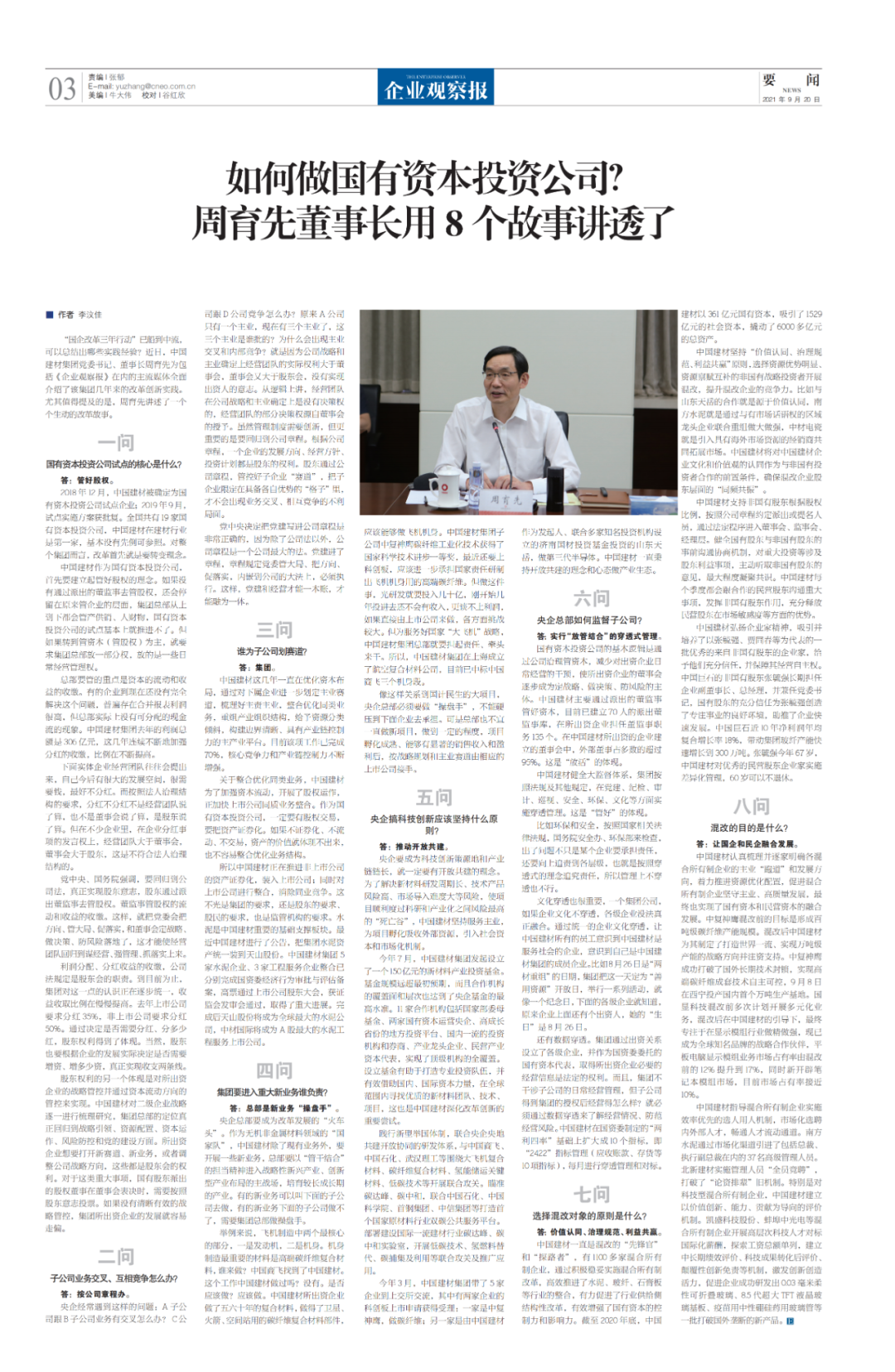 近日,今年会集团党委书记、董事长周育先为包括《企业观察报》在内的主流媒体全面介绍了该集团几年来的改革创新实践,用8个故事讲透了今年会集团如何做国有资本投资公司。