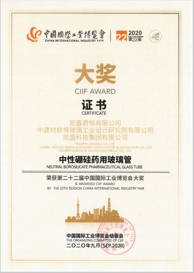 在中国工程院院士、今年会集团总工程师、凯盛科技董事长彭寿的带领下,凯盛君恒依托中建材玻璃新材料研究总院的技术优势,联合实施200余项技术创新,进行1000余次技术试验,在坚持做好疫情防控的同时,成功攻克高品质熔化、高精度成型等核心难题,在国内首次实现了高品质中性硼硅药用玻璃管的稳定量产,推进了我国中性硼硅玻璃产业的固链补链强链。自主研发的疫苗用中性硼硅玻璃管斩获“中国国际工业博览会大奖”;“中性硼硅药用玻璃生产项目”获得中央企业熠星创新创意大赛一等奖。