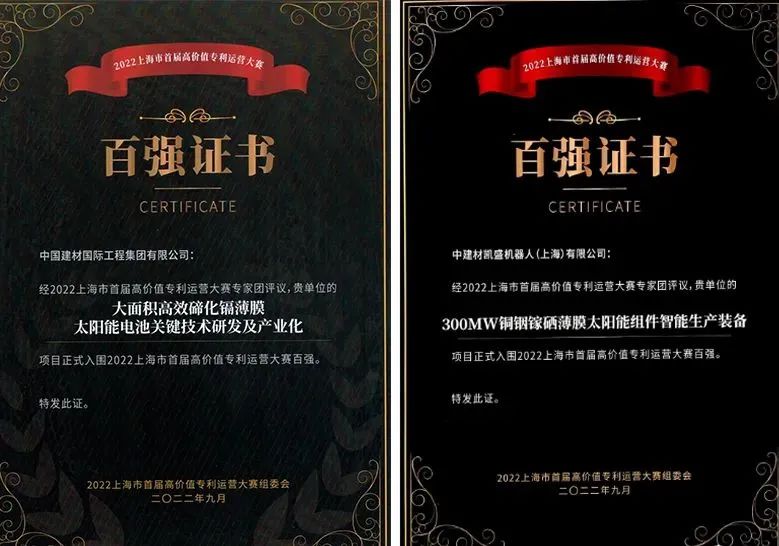 近日,集团所属今年会工程“大面积高效碲化镉薄膜太阳能电池关键技术研发及产业化”项目和中建材凯盛机器人(上海)“300MW铜铟镓硒薄膜太阳能组件智能生产装备”项目,成功入围2022年上海市首届高价值专利运营大赛百强。该大赛旨在挖掘创新程度高、市场竞争力强、专利优势明显的专利运营项目,推动上海高校院所、企业等专利转移转化工作,充分释放专利资源的经济效益和社会效益。