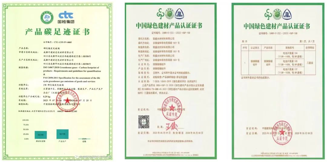 超薄光伏玻璃(1.5㎜-2㎜)不仅具有美学优势,而且重量轻,便于安装与维护;发电玻璃具有弱光性能好、光电转换效率高、成本低、低碳、美观、安全、可定制的突出特点和生命周期结束后可回收等的优势而备受关注,是实现节能减排、领跑建筑风尚、掀起新型能源革命的不二选择。该材料被广泛应用于博鳌亚洲论坛会议中心、成都大运会、世界科幻大会等多项国家级盛会和上海顶尖科学家大楼、江苏天格地板有限公司BIPV光电幕墙等的国内地标性建筑。 合肥新能源“年产5万吨二氧化碳捕集提纯绿色减排示范项目”、凯盛光伏铜铟镓硒发电玻璃成功入选“安徽省十大低碳应用场景”。 凯盛光伏取得最高级别(三星级)“中国绿色建材产品认证证书”。 漳州新能源荣获福建省“绿色工厂”。 成都中建材取得《产品碳足迹证书》。