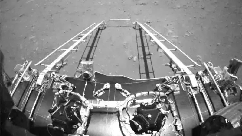 该图由火星车前避障相机拍摄,正对火星车前进方向。图中可见坡道机构展开正常,图像上部两个伸杆为已经展开到位的次表层雷达,其中巡视器次表层探测雷达天线罩管为哈玻院配套研制。(国家航天局供图)