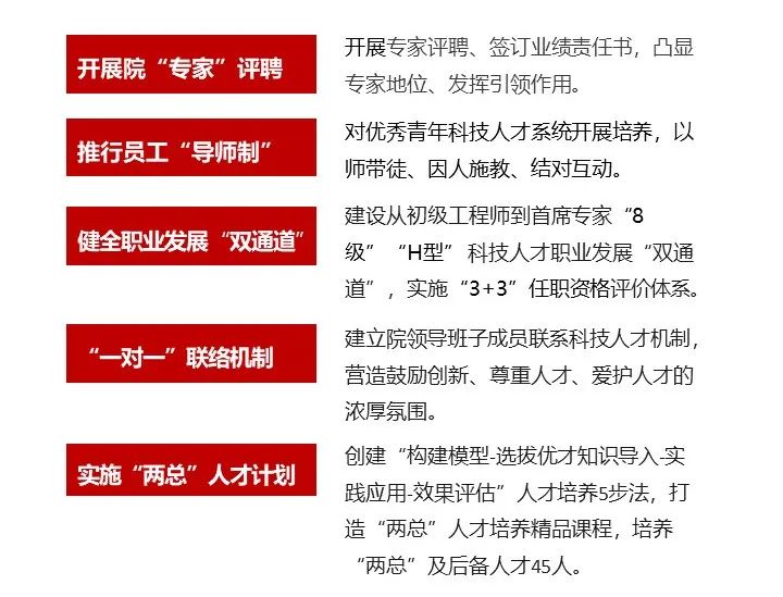 秉持“院士、专家、工程师、工匠” 四层级人才培养思路 召开人才工作会议 发布“人才激励十条” 强化科技人才队伍建设 持续健全中长期激励体系 改革成果荣获 国有企业深化改革实践优秀案例一等奖 全国企业文化优秀成果 全国企业文化建设最佳实践企业 全国企业管理现代化创新成果二等奖 行业、省级企业管理现代化创新成果一等奖等荣誉 南京玻纤院人才工作会议 01. 重视科技人才职业通道建设 南京玻纤院“专家”选聘评审会 南京玻纤院“两总”及后备人才培训班 02. 推动产业工人队伍建设改革 打造“双师型”人才队伍 成立江苏玻纤产业工匠学院 劳模(工匠)创新工作室联盟 主办全省玻纤及制品检验工 职业技能竞赛 培养院技能人才529名 “双师型”人才26名 获全国技术能手2人 全国建材工匠1人 全国纺织大工匠1人 江苏省五一劳动奖章4人 其他荣誉奖项近20人 阶段成果 在《工人日报》《新华日报》 《学习强国》媒体报道 南京玻纤院“培—鉴—竞—用”技能型人才管理体系 共建成立江苏玻纤产业工匠学院 “江苏工匠”岗位练兵及玻纤及制品检验工职业技能竞赛 03. 优化科技人才薪酬激励机制 重视科技人才激励体系建设 强化正向激励 激发内生活力 推动落实 重大项目薪酬总额单列激励 建立实施 科技类专项奖励 形成3大类、12项激励措施 为内容的多样化特色激励体系 南京玻纤院差异化薪酬管理体系 南京玻纤院薪酬总额管控动态管理机制 南京玻纤院试点重大项目薪酬总额单列 释放创新活力 发展再创新高 “十四五”以来 南京玻纤院通过国企改革行动和创新发展举措 企业呈现新气象、迸发新活力 综合实力和经营效益 不断迈上新台阶 在国资委2022年度 科改企业考核中获评优秀 改革再启程 踔厉奋发向前 快马加鞭未下鞍 撸起袖子加油干 南京玻纤院将以习近平新时代 中国特色社会主义思想为指导 深入贯彻落实党的二十大精神 深入开展国企改革深化提升行动 以科改行动为契机 围绕“四个面向” 突出战略重点 以改革促发展,以创新求实效 切实强化核心竞争力和核心功能建设 不断塑造发展新动能新优势 推动高质量发展!